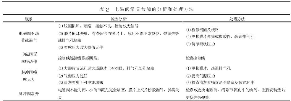 在除塵器的日常運(yùn)行中,由于運(yùn)行條件會(huì)發(fā)生某些改變,或者出現(xiàn)某些故障,都將影響設(shè)備的正常運(yùn)轉(zhuǎn)狀況和工作性能,要定期地進(jìn)行檢查和適當(dāng)?shù)恼{(diào)節(jié),降低動(dòng)力消耗及回收有用的物料。 同時(shí),特別要堵住除塵器排灰口的漏風(fēng),因?yàn)樵诔龎m器的灰斗中有大量緩慢下落的粉塵, 逆流向上的漏風(fēng)氣流又造成下落粉塵的二次飛揚(yáng)及多次循環(huán), 因而排灰口漏風(fēng)可使除塵器內(nèi)的粉塵濃度成倍地高于入口的粉塵濃度, 這樣_惡化了除塵器的工作條件,影響了除塵效率[5] 。 除塵器常見(jiàn)故障的分析及處理方法見(jiàn)表 1,電磁閥常見(jiàn)故障的分析和處理方法見(jiàn)表 2。