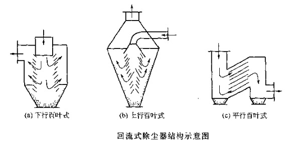 (2) 回流式除塵器結(jié)構(gòu)形式 該除塵器特點是把進氣流用擋板分割為小股氣流。為使任意一股氣流都有同樣的較小回轉(zhuǎn)半徑及較大回轉(zhuǎn)角,可以采用各種擋板結(jié)構(gòu),_典型的便如圖所示的百葉擋板。